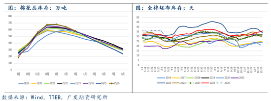 目前2026/27年度新棉逐步种植,但面积具体降多少市场仍未有明确定论,若相关部门管控严格,面积降幅超过100-250万亩,幅度在5%-7%之间,整体仍存在一定缩减空间,为市场提供中长期支撑。同时新疆新棉播种进度偏快,近期局部大风沙尘及降雨造成部分覆膜被撕揭吹损,后续天气扰动仍存,市场对新季产量的不确定性溢价逐步抬升。另外,虽然截至目前,新疆维吾尔自治区2026年棉花目标价格政策尚未发布新的官方实施方案,但根据2026年中央一号文件继续“完善棉花目标价格政策”的要求,业内普遍认为2026年的棉花补贴政策将延续实施,但会更加聚焦质量提升与金融工具创新。